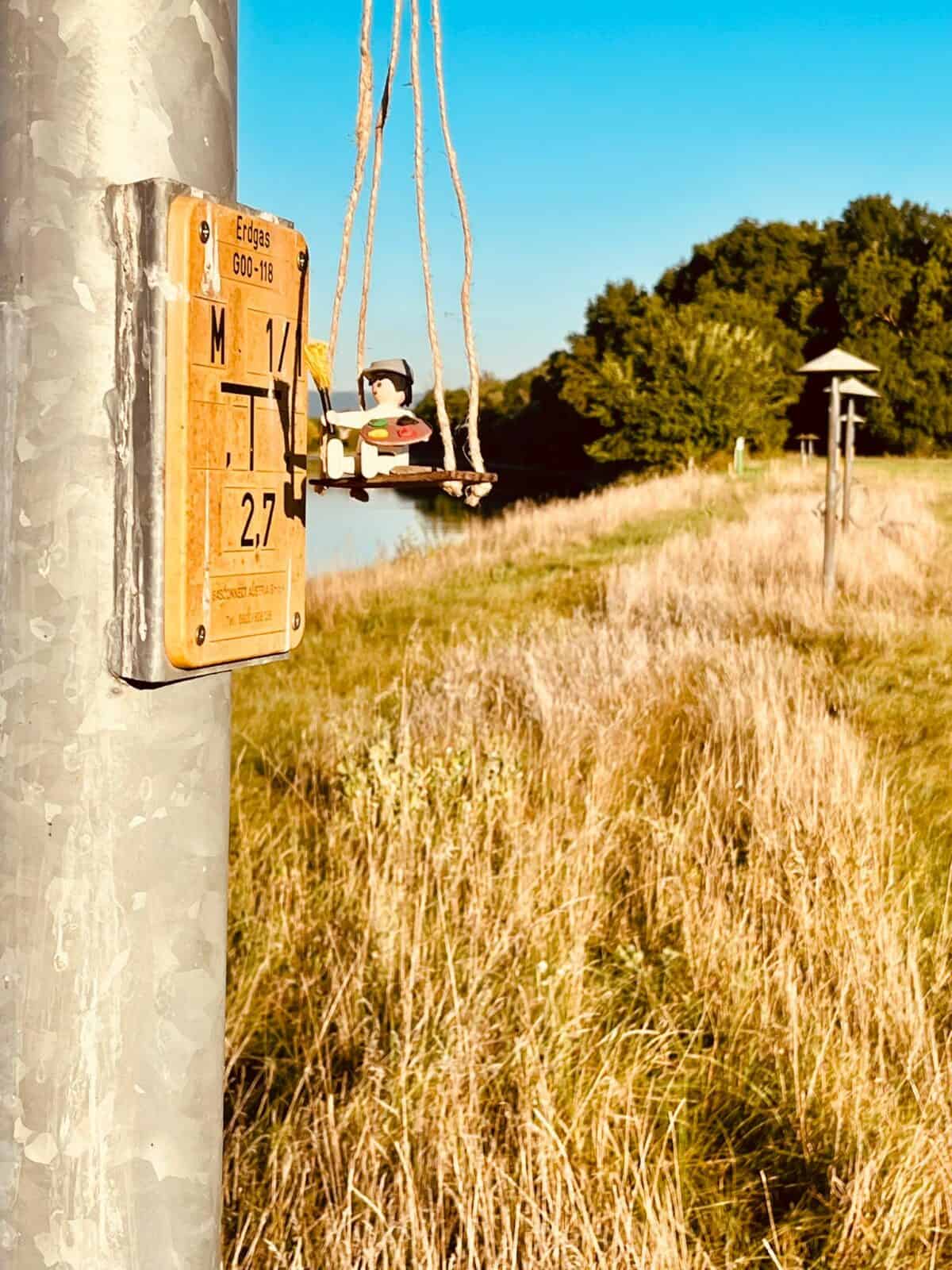 Das Foto zeigt eine winzige Spielfigur, die auf einer selbstgebauten Schaukel direkt an einer Markierungsplakette schwingt. Die Jury war begeistert von dieser charmanten Gegenüberstellung: Der Kontrast zwischen der wichtigen, aber nüchternen Markierung und der verspielten Miniaturszene erfüllt das Motto „Mach das Unsichtbare sichtbar“ in einer besonders kreativen Form.