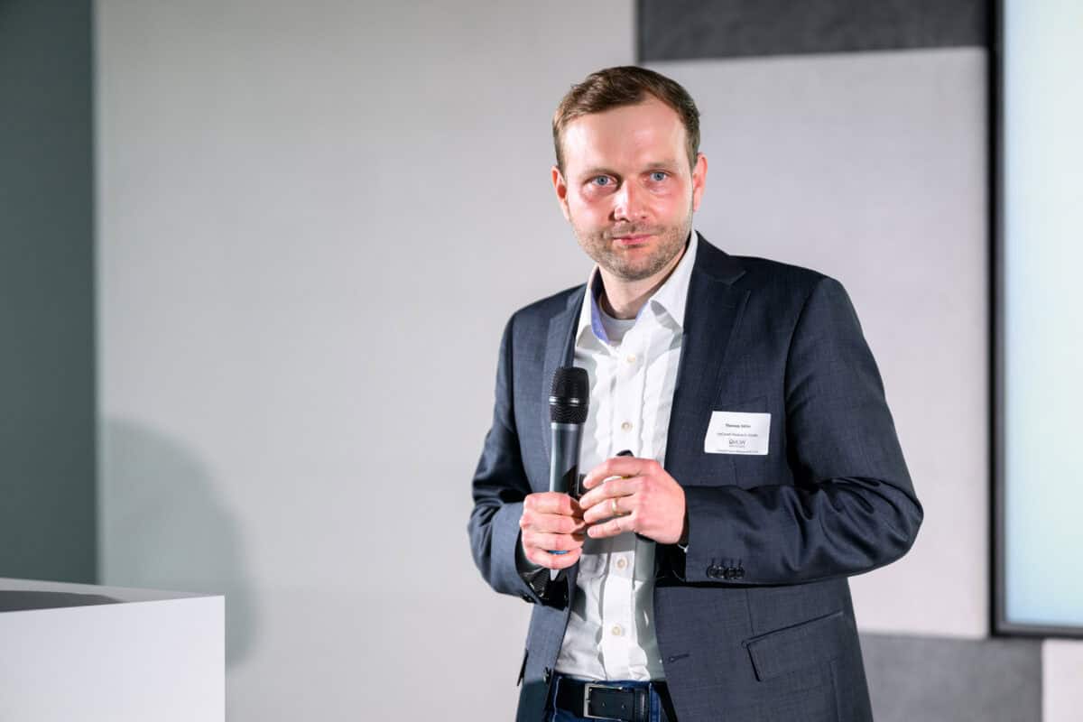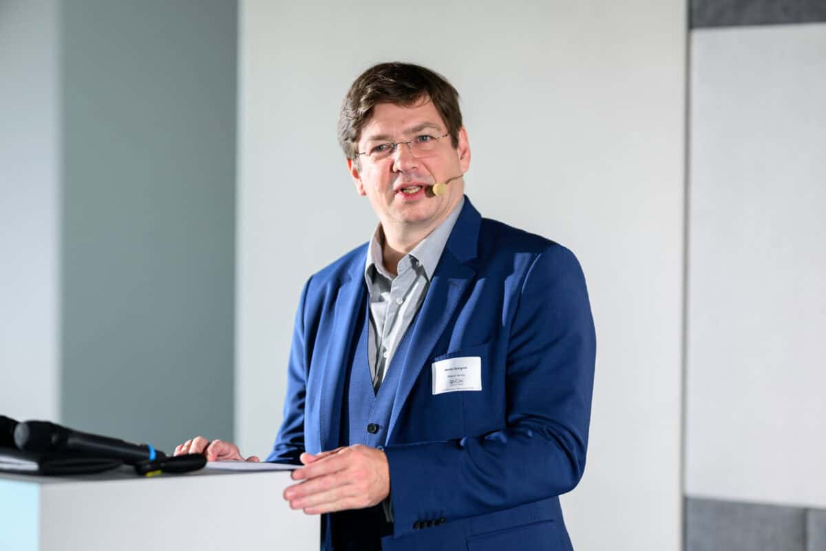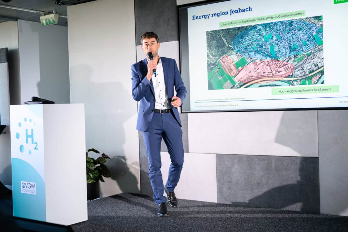 Andreas Burger (TINEXT-Next Energy Solutions GmbH) berichtete von der Kooperation mit der Gasmotorenfirma INNIO. Durch die enge Zusammenarbeit kann eine Sektorkopplung mit einem Wirkungsgrad von 90 % erzielt werden: Der von TINEXT produzierte Wasserstoff wird zur Motorentestung an INNIO übergeben, während die entstehende Abwärme für das Fernwärmenetz genutzt wird.
